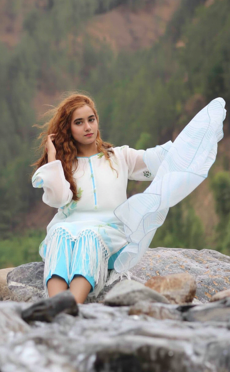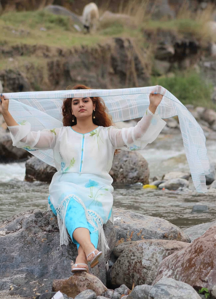 The foundation of the Azure Bloom Lawn Ensemble is our high-grade, artisanal Lawn. Chosen for its lightweight, soft-to-the-touch feel and incredible breathability, this lawn provides a regal drape for the kurta and trousers. It is the premier choice for a 3-piece silhouette because it maintains a crisp, polished look even in the warmest climates. The set is completed by a stunning striped organza dupatta, which adds a luxurious layer of texture and a radiant finish to the entire ensemble.