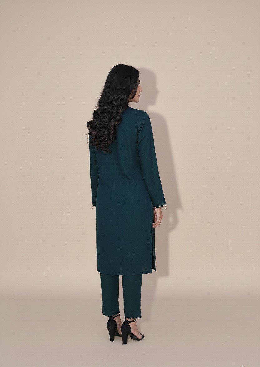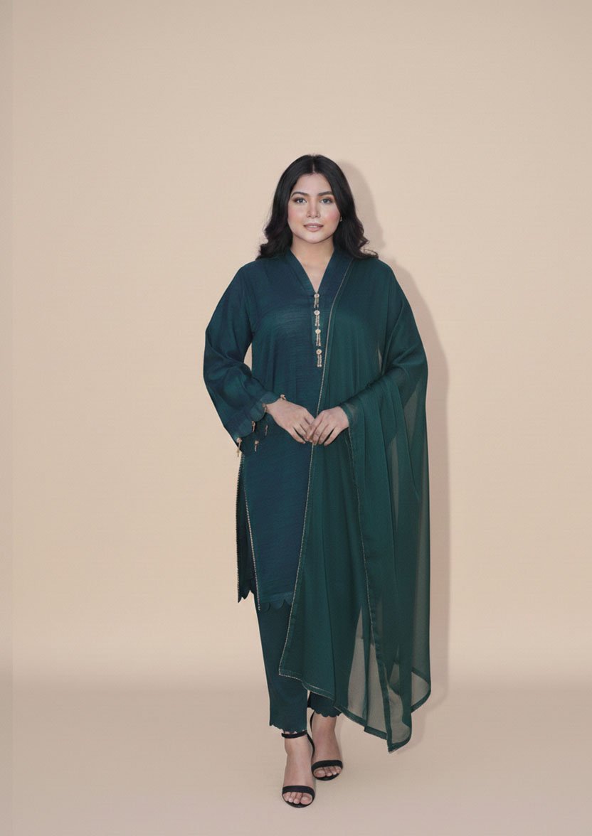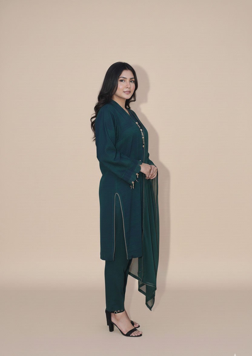Emerald Tassel Sovereign Suit by Asmar Poshak is a breathtaking masterpiece that redefines the intersection of traditional elegance and Western-fusion silhouettes. Designed for the woman who seeks a flawless and commanding presence, this 3-piece ensemble utilizes a rich, deep teal palette that radiates a sense of regal authority. Crafted from our signature premium lawn, every element of this suit—from the exquisite tassel work on the neck to the ethereal shaffon dupatta—is curated to ensure you look stunning at every high-fashion event.