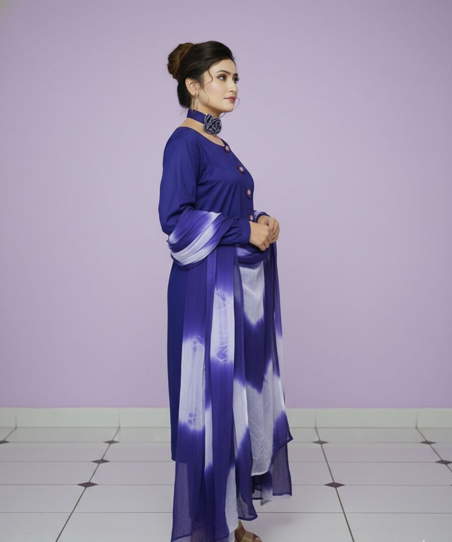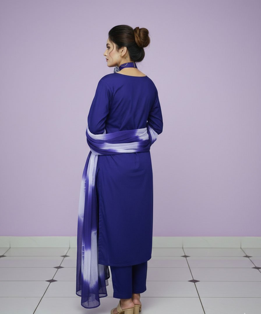 • The Dupatta Drape: Wrap the shaffon dupatta loosely around your neck to create a soft, romantic frame for the 3-piece suit.