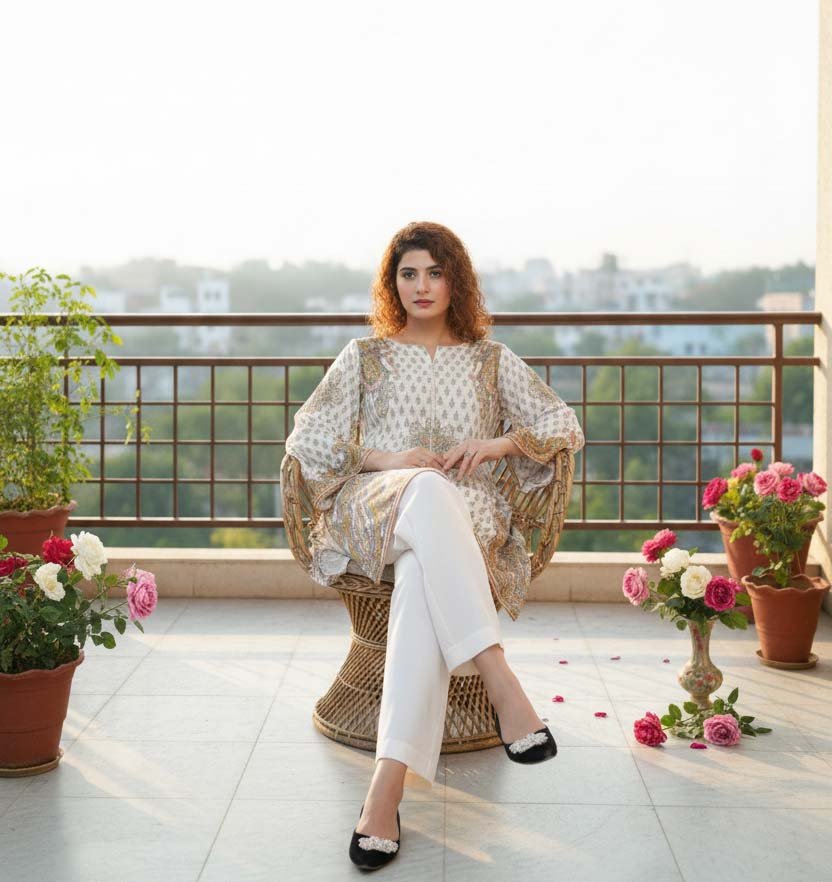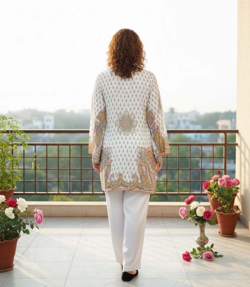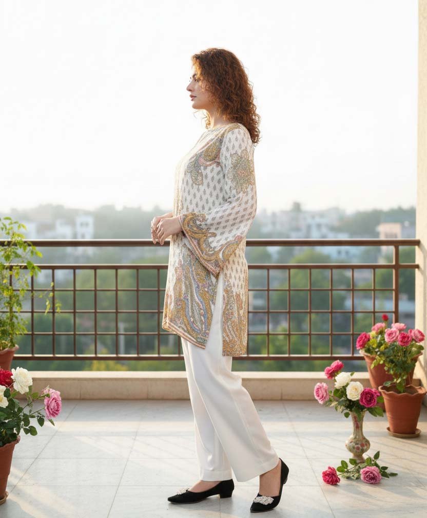 Step 1: The Modern Western Tunic: The top of the Luxurious Ivory Paisley Silk Symphony features a contemporary Western cut with flared, wide-cut sleeves and a subtle V-neckline. This design provides an enchanting and international flair that transitions perfectly from daytime events to evening social soirées.