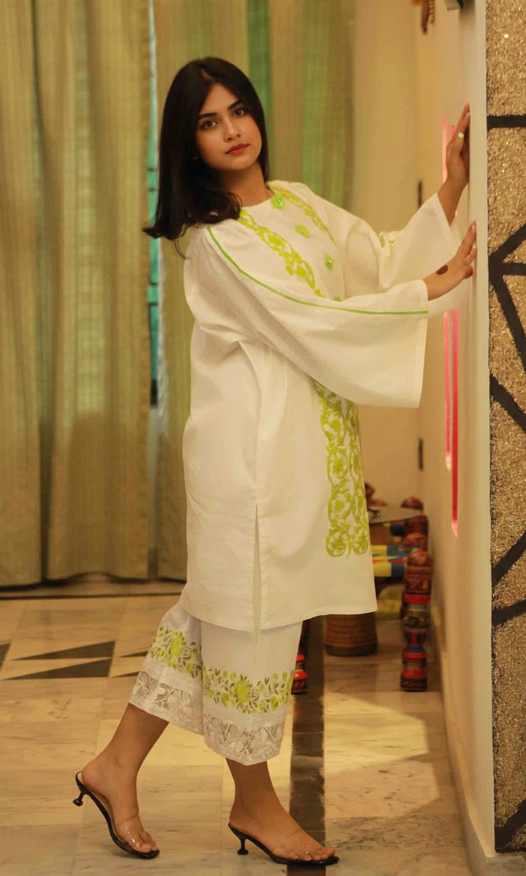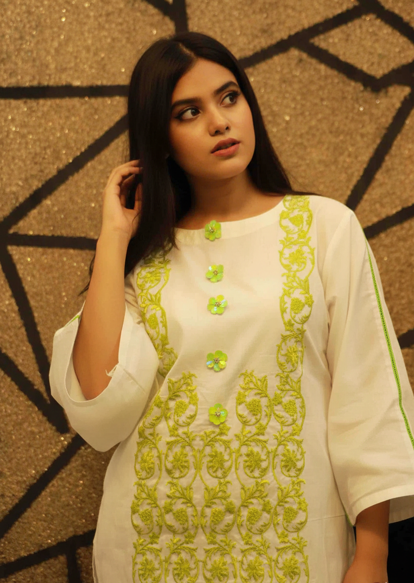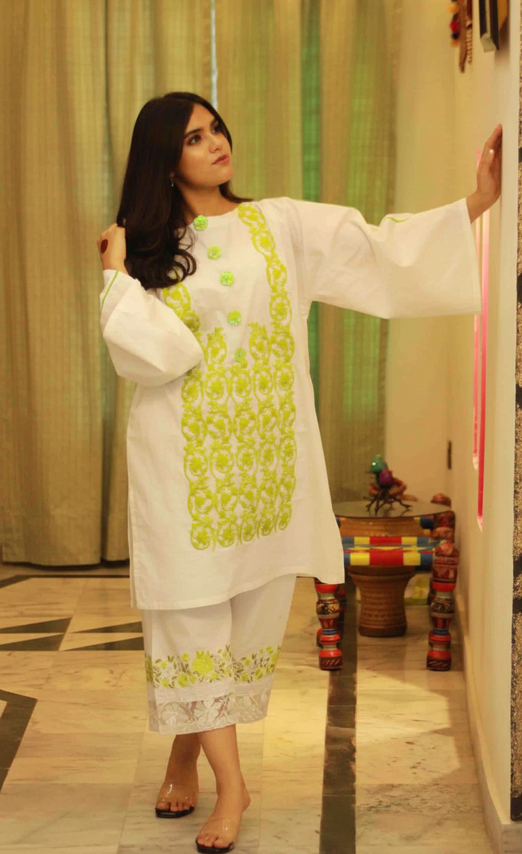 The foundation of the luxurious Neon Blossom Lawn Trio is our high-grade, artisanal Lawn. Chosen for its lightweight, soft-to-the-touch feel and incredible breathability, this lawn provides a regal drape for the entire set. It is the premier choice for a 3-piece silhouette because it maintains a sharp, tailored look even in warmer climates. The fabric is expertly treated to hold its vibrant white and lime tones, providing a luxurious and radiant canvas for our detailed artistry.