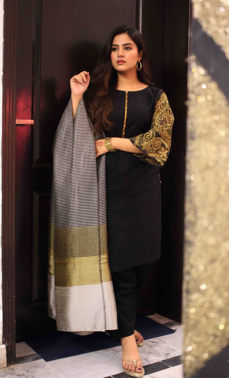 Obsidian Gilded Lawn—the ultimate 3-piece masterpiece for the modern season. Crafted from premium, breathable lawn, this ensemble features intricate hand work on the sleeves and a stunning metallic-striped dupatta. Elevate your formal wardrobe with this exquisite and radiant statement of luxury