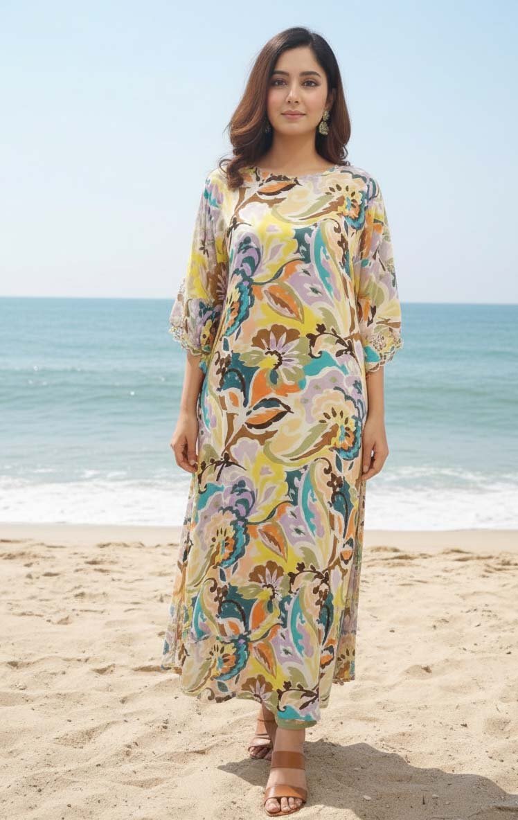 Radiant Yellow: A vibrant, sun-drenched hue featuring a kaleidoscopic pastel floral print. It is the perfect choice for a bold, cheerful summer statement.