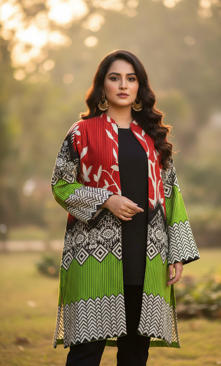 The foundation of the Vibrant Mosaic Cape is high-grade Khaddar fabric. Selected for its rich texture and incredible durability, our Khaddar provides a flawless structure that allows the cape to drape with majestic elegance of asmar poshak. This fabric is ideal for seasonal transitions, offering a soft hand-feel and a crisp, tailored look. The weave is specifically optimized to hold vibrant dyes, ensuring that the fiery reds and zesty lime greens remain radiant and deep over time.